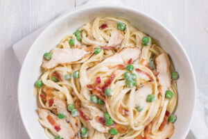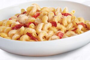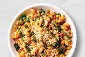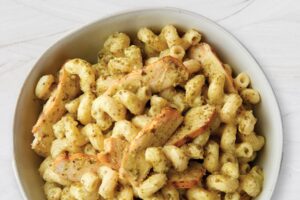 grilled chicken, Parmesan, spinach, oven-roasted tomato, cavatappi pasta, pesto, tomato cream sauce, toasted breadcrumbs