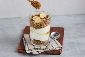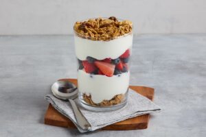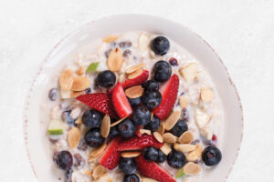 rolled oats, vanilla yogurt, apple, banana, dried currants, dried cranberries, strawberry, blueberry, toasted almonds