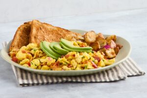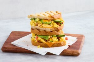 scrambled eggs, bacon, tomato, green onion, avocado, cheddar, grilled sourdough