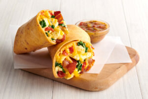 scrambled eggs, bacon, cheddar, spinach, oven-roasted tomato, tomato basil tortilla