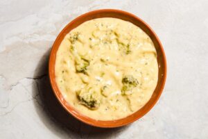 Generous pieces of tender broccoli florets simmered in a rich, cheesy broth.