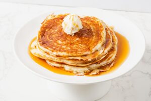 four fluffy buttermilk pancakes with butter and vanilla maple syrup