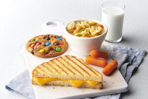 Any half kids’ sandwich paired with a small soup and your choice of bakery chips or baby carrots. Served with your choice of fresh fruit or freshly baked cookie and milk, 12 oz soft drink, or kids’ juice.