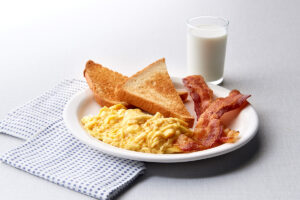 Choose from scrambled eggs or pancakes. Served with bacon or fresh fruit and milk or kids’ juice.