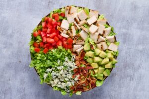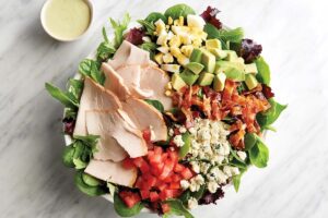 mixed greens, oven-roasted turkey, bacon, hard-boiled egg, bleu cheese, avocado, tomato, avocado ranch dressing
