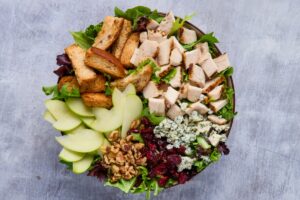 mixed greens, grilled chicken, apples, cranberries, bleu cheese, walnuts, harvest croutons, balsamic vinaigrette