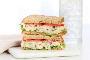 albacore tuna, celery, red onion, green onion, lettuce, tomato, tuna dressing, harvest toast
