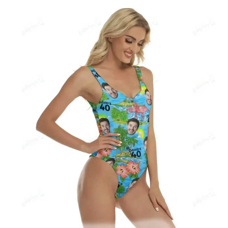 Custom Face Swimsuit, Custom Birthday Bathing Suit with Face and Age, Hibiscus Swimsuit, Flamingo Suit