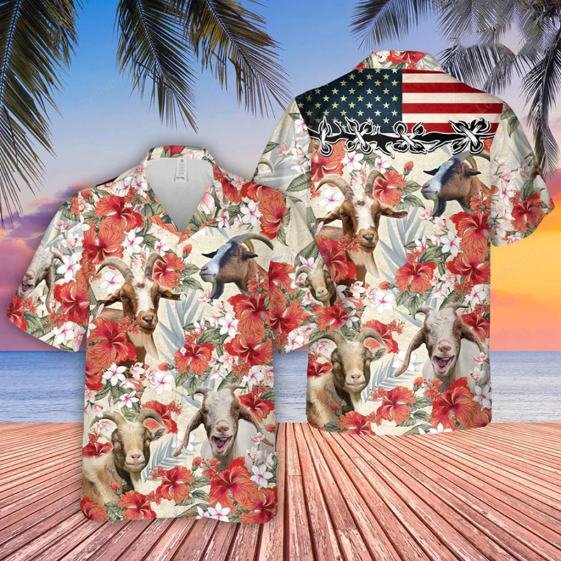 Goat Hibicus Floral Us Flag 3D Hawaiian Shirt, Summer aloha shirt Men and women