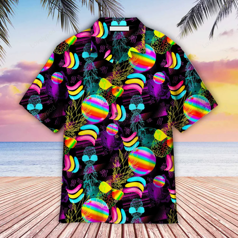 LGBT Aloha Hawaiian Shirts For Summer, Pineapple Tropical Neon Rainbow Happy LGBT Pride Month Colorful Hawaiian Shirts